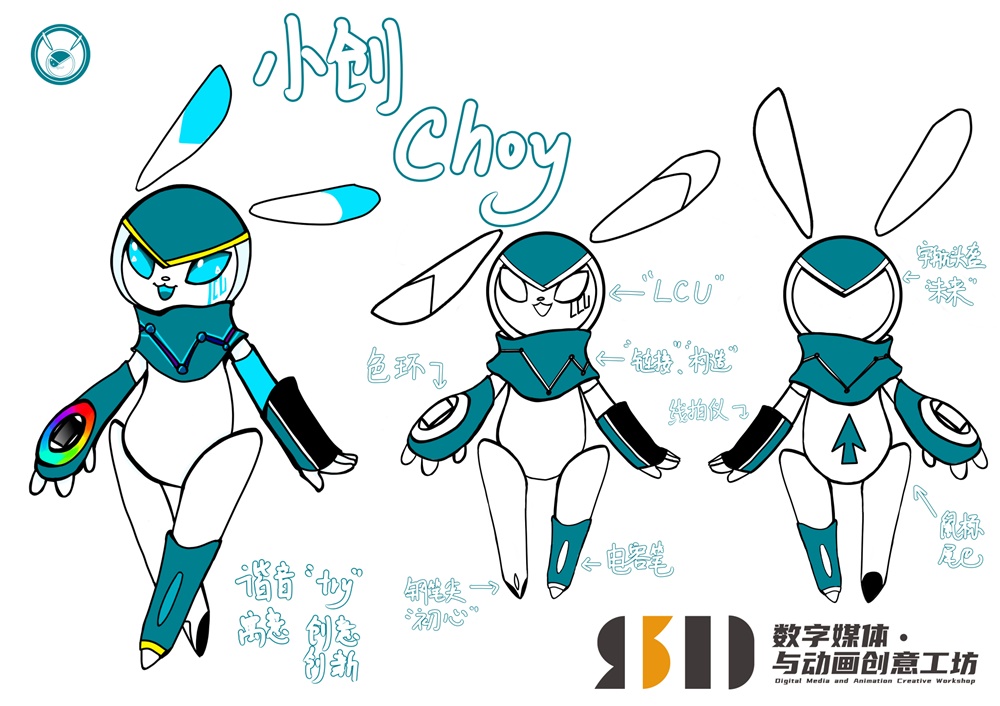 商公司的王禹骁同学设计的作品名为“小创choy”,与“try”同音,寓意着创意、创新;小创面部带有“LCU”字母样式,代表w66;宇航头盔代表着“未来”;两腿设计为电容笔和钢笔尖。整体蓝绿色的设计凸显科技感和未来感,手臂上五彩的色环也为作品增添了一抹亮色,展现了积极向上的工坊形象。工坊吉祥物设计表达的不仅是一种追求和愿望,更是反映了社团的理念与特征。经过鉴定评选,此次比赛共评出15个优秀的作品,展现了工坊部落的成员的创新精神和艺术审美。