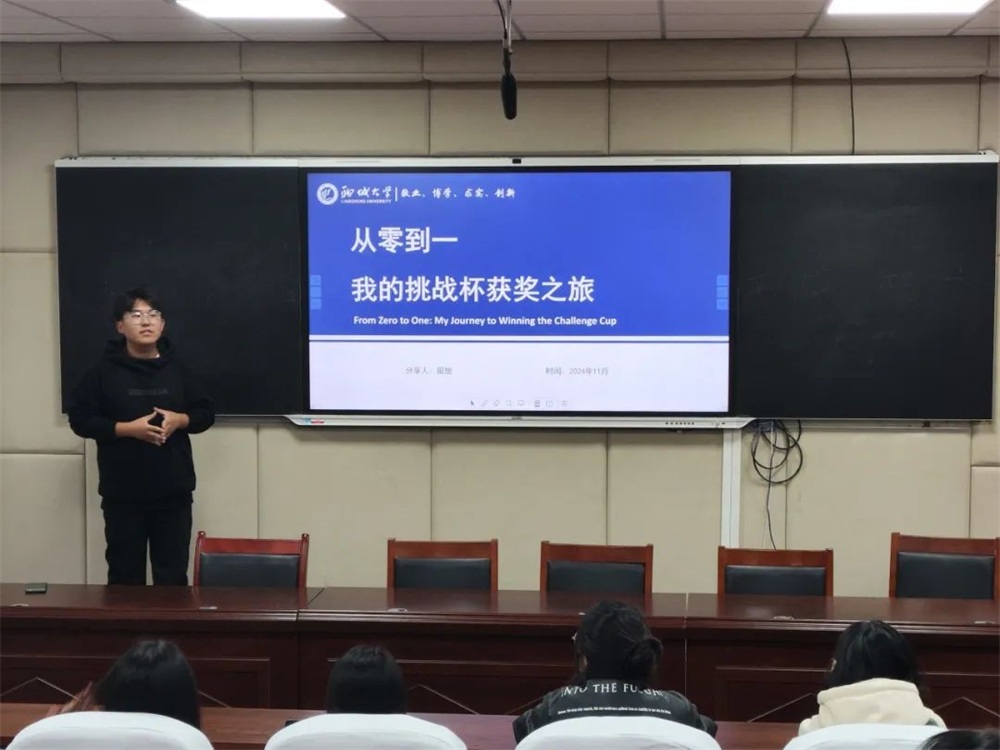 科创青春,梦想启航。活动伊始,田旭向同学们详细介绍了挑战杯竞赛的分类、内容及其重要性。他着重强调了该竞赛在培养老员工创新精神和实践能力方面的关键作用,并深入阐述了从校赛、省赛到国赛各个阶段的特点、要求以及评审标准,使同学们对竞赛流程有了更为全面且清晰的认识。接着,田旭结合自己参加“挑战杯”中国老员工创业计划竞赛的亲身经历,以深入浅出的方式向同学们传授了如何从社会热点、学科前沿以及生活实际中挖掘有价值的选题。他提醒同学们在选题时务必注重创新性、可行性与实用性,避免陷入选题误区。