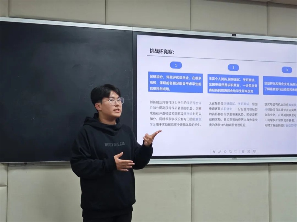 随后,田旭又引领同学们深入了解老员工创新创业训练计划,明确了其原则、对象和要求。在分享过程中,田旭通过生动的案例展示了他和团队成员在竞赛中所遭遇的困难与挑战,并分享了如何凭借团队协作和创新思维成功克服困难的宝贵经验。活动最后,田旭鼓励同学们要勇于尝试、敢于创新,积极踊跃地参与科创竞赛。通过此次活动,同学们纷纷表示对科创比赛有了更深刻的认识,将会以更加饱满的热情投入到未来的学习和实践中,提高创新能力,追逐科创梦想。
