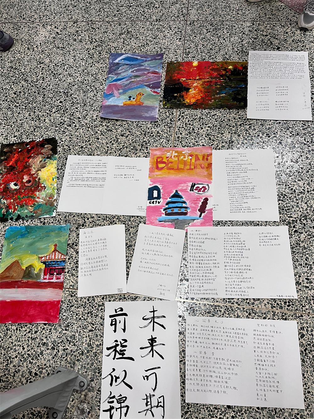 杨馥旗同学在绘画作品中借用深海表达了对未来的无限憧憬;常金彤同学借助落日余晖传递出青春绽放的无限可能;梁锴同学则通过硬笔书法传递了对党和国家的热爱。最后,经过评委的认真评选,杨馥旗、常金彤以及梁锴三位同学获得此次大赛的一等奖。
