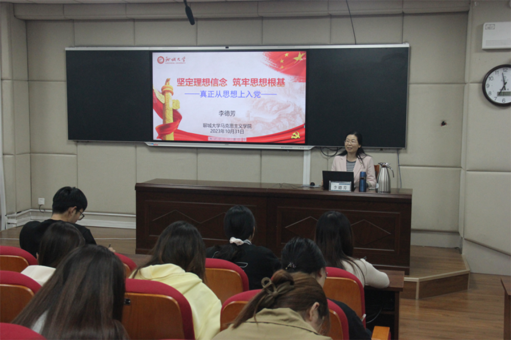为学习贯彻习近平新时代中国特色社会主义思想主题教育的重要讲话精神,引导入党积极分子进一步坚定理想信念,既从行动上入党,又从思想上入党,坚定“听党话,跟党走”,时刻以党员标准严格要求自身,10月31日,w66旗舰厅于11#A401举办了“坚定理想信念,筑牢思想根源”党课宣讲活动。w66旗舰厅特邀李德芳老师担任本次活动的主讲人,w66旗舰厅第30期入党积极分子参与了此次活动。