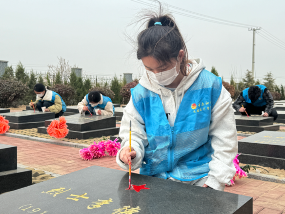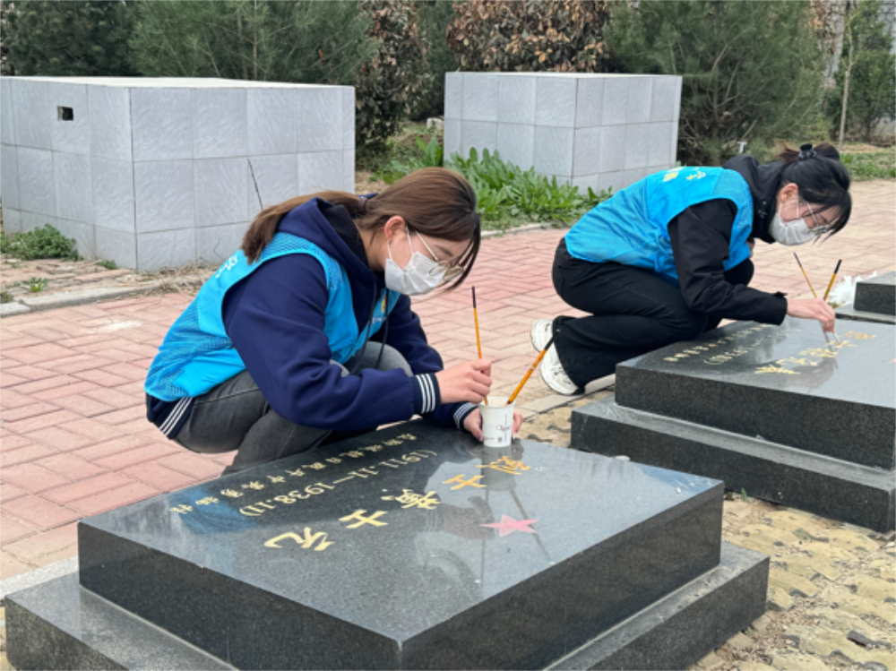 在烈士墓区,成员们列队来到英烈墓碑前,自发向烈士墓行肃穆礼。随后,志愿者们分组有序地开展碑文残漆清理、碑面清洁、饱满描金等一系列工作。每位成员俯身埋头在烈士墓碑前,仔细擦拭墓碑,去除微尘,手持毛笔,一笔一划地将每座座墓碑上的字迹描画清晰,每一次的描摹,都饱含着对烈士的深切缅怀和崇高敬意。活动结束后,宋腾飞同学在谈及感受时提到,每一座墓碑都是一段难忘的英雄事迹,描画墓碑的过程不仅是与烈士们的心灵交流,更是作为当代老员工对革命精神的一种传承。