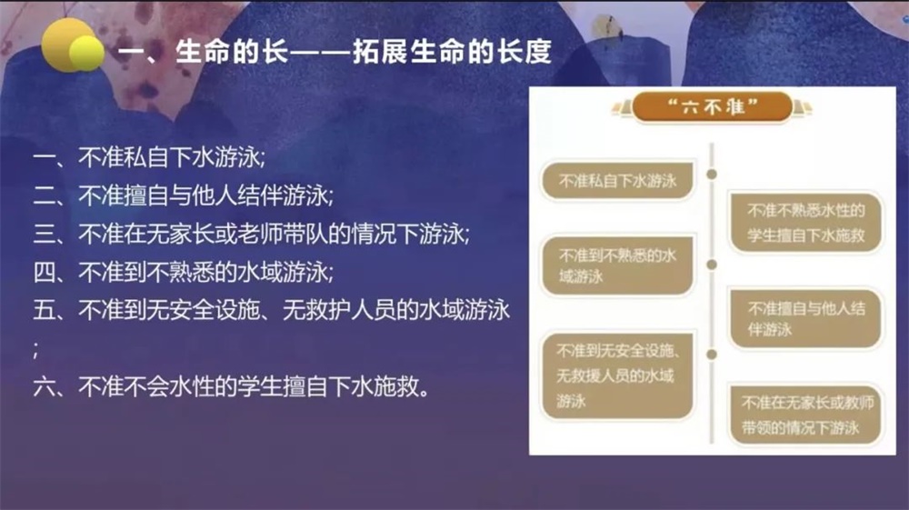 此次讲座的主题是“拓宽生命的长宽高”,曹专围绕如何拓宽生命的长度、宽度、高度展开了讲解。关于如何拓宽生命的长度,曹专在预防溺水、预防交通事故、树立健康意识方面进行了详细的叙述。在预防溺水方面,曹专提到了“六不准”,要求同学们严于律己,关爱自己的生命健康安全。