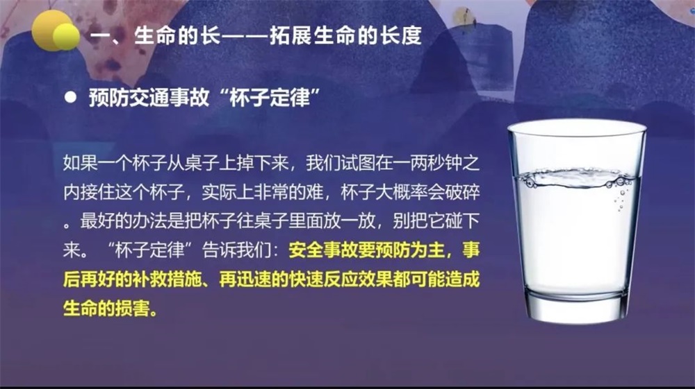 在预防交通事故方面,他给同学们提供了“杯子定律”,警示同学们安全事故要以预防为主,事后再好的补救措施、再迅速的快速反应效果都可能造成生命的损害。