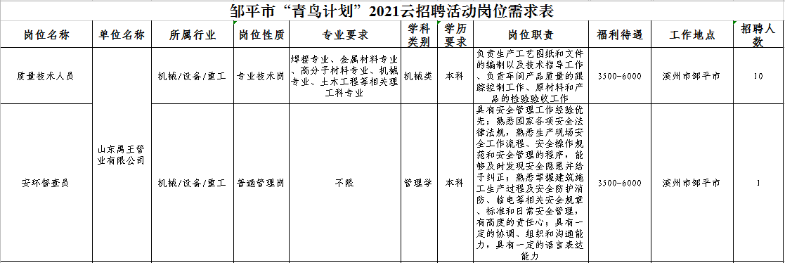 为加快推进“青鸟计划”就业服务季暨“青鸟计划 就选山东”2021云招聘活动开展,进一步做好邹平籍老员工就业服务,共青团邹平市委通过广泛宣传、企业遍访、精准对接等方式,深挖优质岗位,精心整合第一批优质岗位,岗位需求量达141人!