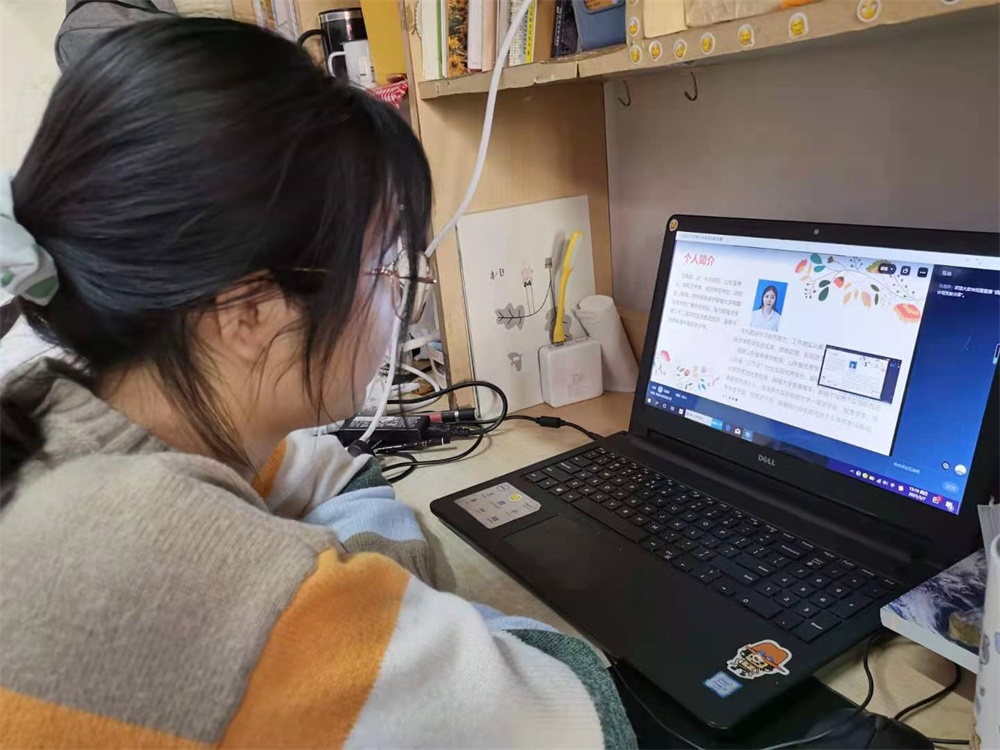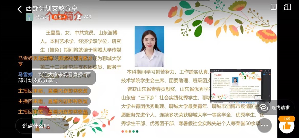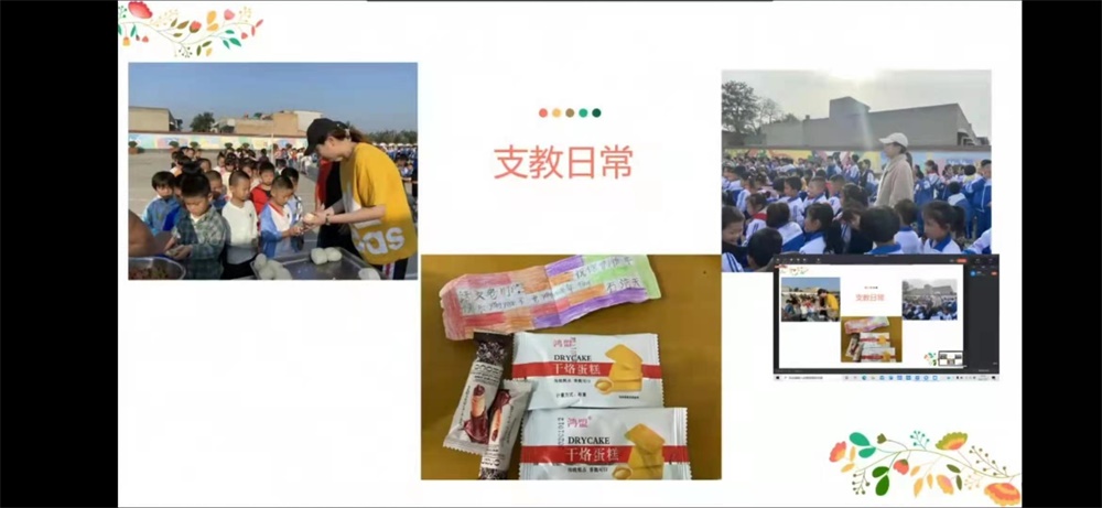 本次活动采用钉钉平台直播的形式进行。王晶晶和李锦娜两位同学就自身服务西部的实际支教生活和大学学习经验进行介绍,让同学们对西部计划形成一个正确的认识和了解。王晶晶同学结合自身大学学习和生活的经验向同学们提出了学习、工作、生活、自律四个方面的建议,并通过讲解PPT为同学们展示了自己的支教生活,讲述了自己在支教工作中的收获,其中所播放的短视频充分展现了陕西省渭南市富平县东新小学员工们的童趣和欢乐以及王晶晶作为支教老师的骄傲,她表示自己有决心通过教书育人、扶贫济困,为建设西部美好明天做出自己的一份贡献。