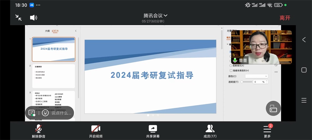 紧接着,于连民老师就复试材料准备、口语面试须知、导师研究领域等方面向员工讲解了注意事项,特别对自我介绍环节进行了专项指导,他强调自我介绍环节主要介绍自己本科做过的与教育技术专业相关的经历以及本科的科研经历,强调要根据自身特点和专业背景撰写自我介绍,同样保持自信、注意语速和语气也十分重要,并且提醒员工们要多了解专业的前沿知识,阅读经典专业书和专业期刊,学会以研究生的视角看待问题,运用学术专业词语回答问题。员工们纷纷表示此次线上指导会不仅增强了他们对复试流程的认识,也提升了他们的自信心和应对复试的能力。