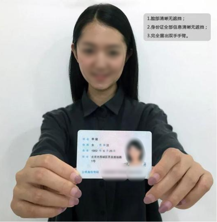 要求:脸部清晰无遮挡、身份证全部信息清晰无遮挡、完全露出双手手臂